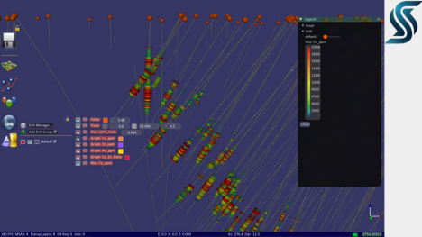 Drill holes with lithology and assay discs as well as multiple downhole graphs.